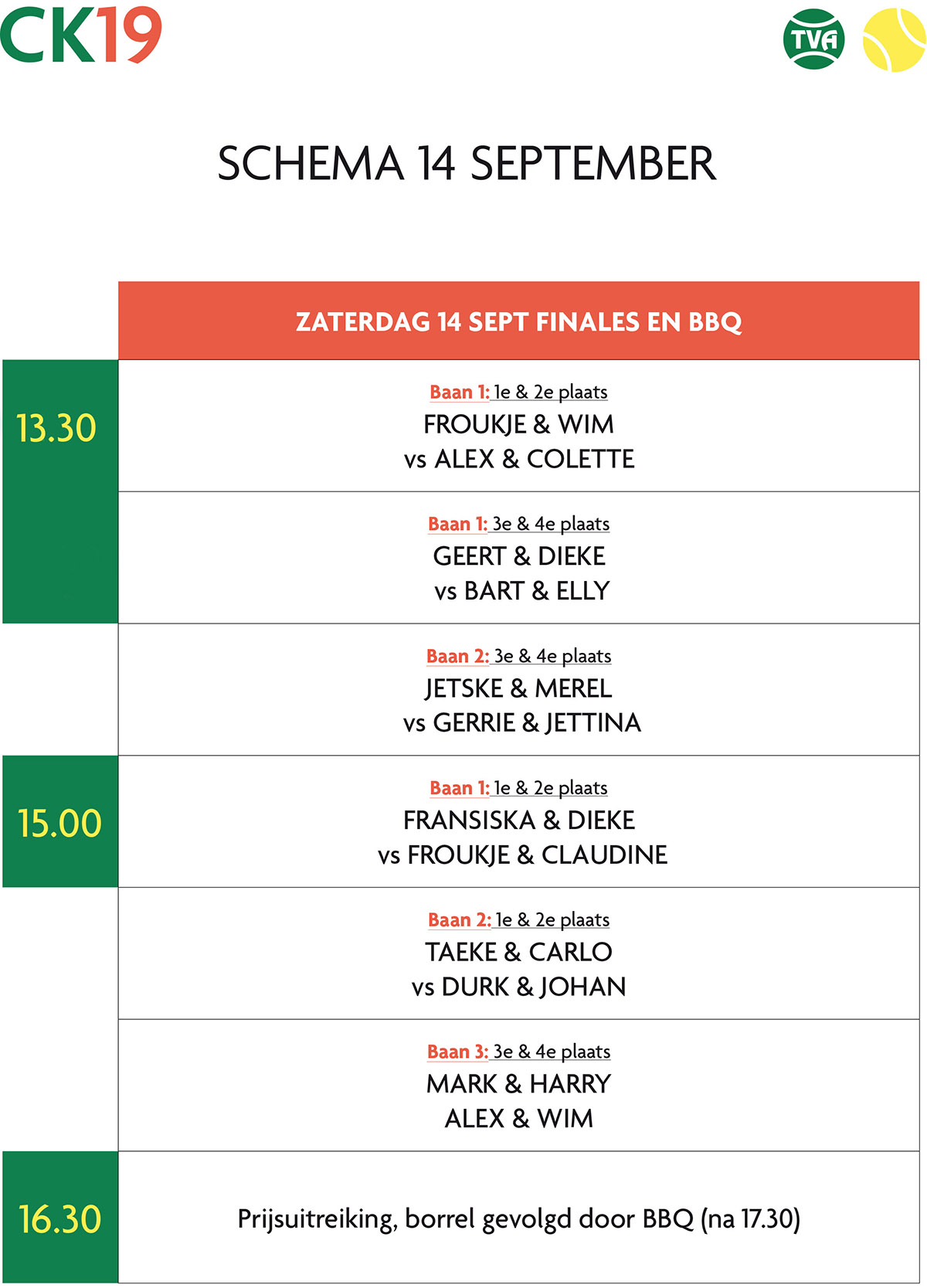 Het speelschema voor de finaledag van de clubkampioenschappen van Tennisvereniging Akkrum is bekend. Vanaf half twee zaterdagmiddag worden de kruisfinales en finales gespeeld. De titelstrijd in de herendubbel gaat tussen Taeke Westra/Carlo Bloem en Durk Kooistra/Johan van der Sluis. In de damesdubbelstrijden Fransiska Mast en Dieke Heerschop tegen Froukje Porte en Claudine Koers. De titel in de gemengd dubbel komt uit de partij tussen Froukje Porte/Wim van Tricht tegen Colette Govaars /Alex de Haan.