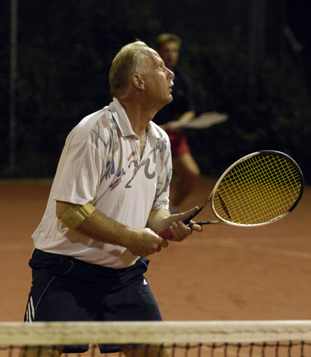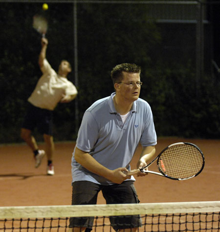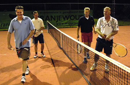 De allerlaatste wedstrijd van de clubkampioenschappen voor senioren 2008 van Tennisvereniging Akkrum. In de A-klasse speelden (v. l. n. r.) Jan-Peter de Boer en Sjoerd de Jong tegen Ytsen Schaap en Henk Mulder. Het laatstgenoemde koppel eindigde als tweede, het andere met nul punten als laatste. Winnaar van de heren dubbel-A-klasse werden Ad Nolte en Alex de Haan.